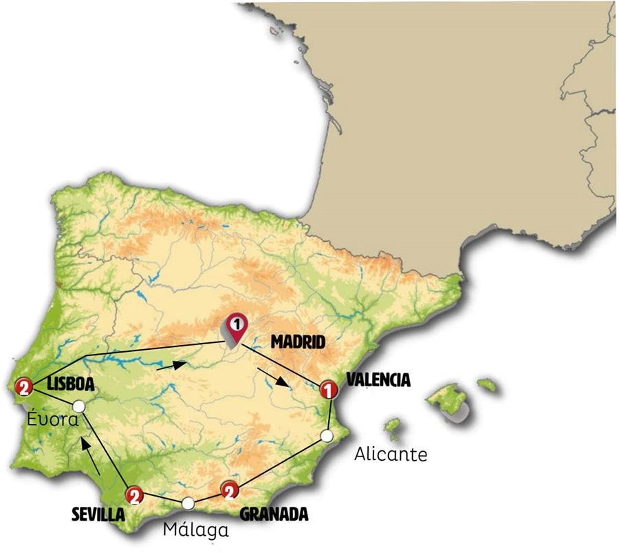 Saldremos temprano de Portugal, atravesamos la bonita region de el Alentejo. Parada para un café en ESTREMOZ, encantadora ciudad con castillo medieval, calles adoquinadas y arquitectura y ambiente tranquilo que reflejan la autenticidad portuguesa. Paso a España. En CÁCERES podrá almorzar y pasear por su centro histórico, uno de los conjuntos urbanos medievales y renacentistas mejor conservados del mundo. Continuación a MADRID, llegada al final del día.
