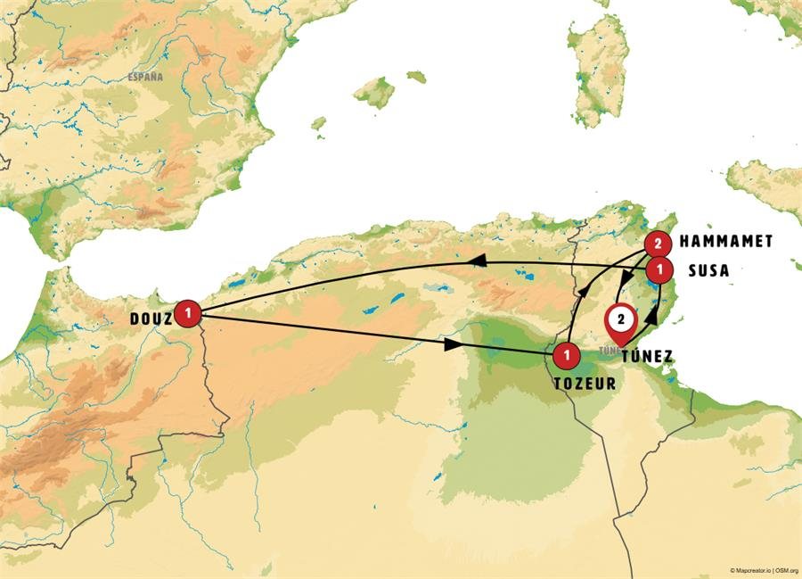 Salimos para visitar el Anfiteatro Romano de El Jem, que rivaliza con el anfiteatro de Roma por su gran tamaño. Continuaremos hacia Matmata, conocida por sus casas trogloditas subterráneas de la tribu Amazigh. Visitaremos una casa típica y descubriremos su arquitectura única y las tradiciones del pueblo berebere, que es el pueblo ancestral de Túnez. ALMUERZO en restaurante típico. Terminamos nuestro día en Douz, también llamada “puerta al desierto”, donde disfrutaremos de la cena y pasaremos la noche en el hotel.