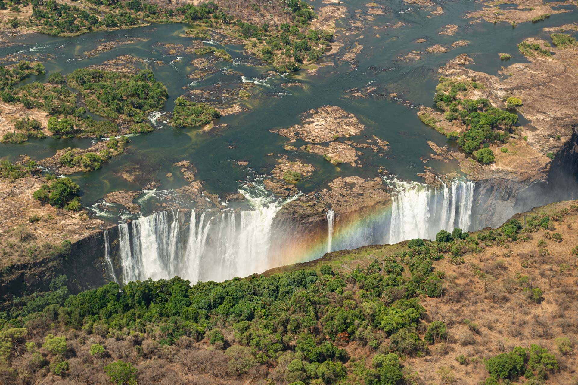 Las Cataratas Victoria son el principal atractivo del viaje a Zimbabue y constituyen la frontera natural con Zambia. Tienen una anchura de 1,7 kilómetros y caen en un estrecho y raro abismo que las vuelve un espectáculo único. Forman parte de dos parques nacionales y fueron declaradas Patrimonio de la Humanidad por la Unesco.