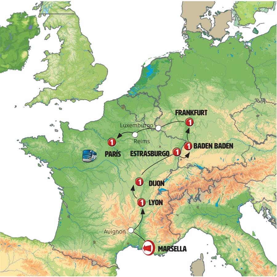Hoy viajamos hacia Francia pasando por el Gran Ducado de Luxemburgo, un pequeño país de habla alemana (dialecto luxemburgues) y francesa. LUXEMBURGO, llegada a esta cosmopolita ciudad que combina una rica historia con la modernidad de ser un centro financiero y sede de instituciones europeas. Además de su casco antiguo, Patrimonio de la Humanidad, destacan sus fortificaciones, el Palacio Gran Ducal y la Catedral de Notre-Dame. Tras la hora del almuerzo pasamos a Francia. En el centro de la region productora del Champagne paramos en REIMS, tiempo para conocer su impresionante catedral gótica, lugar donde se realizaron las coronaciones de muchos de los reyes de Francia. Llegada a PARIS, al final del día.