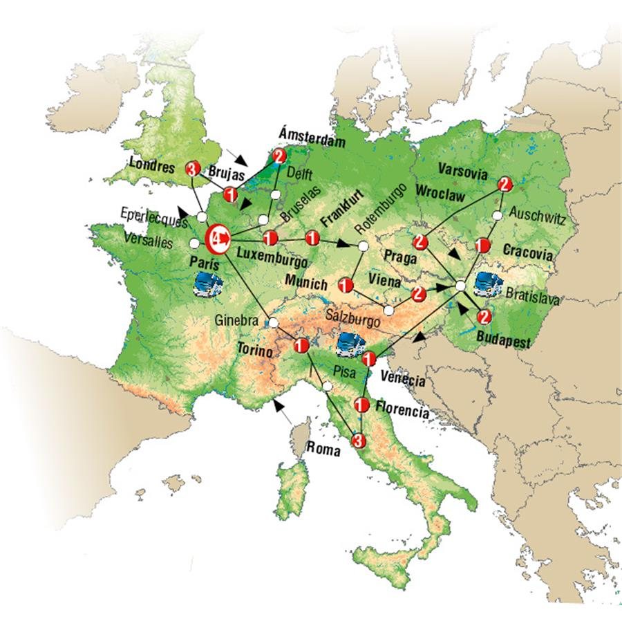 Paradas en Ruta: este circuito admite la posibilidad de que usted pueda programar una o más paradas en su viaje, en la ciudad que desee por período de 1, 3, 4 o 7 noches según circuito y fechas de salida. Es fundamental que el circuito tenga salida posterior a la fecha escogida y permita la salida deseada. El suplemento por parada efectuada es de 40 Euros/52 Dólares por persona. Si la parada se realiza para tomar otro circuito del mismo proveedor no se abonará este suplemento.