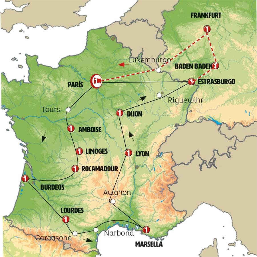 Hoy viajamos hacia Francia pasando por el Gran Ducado de Luxemburgo, un pequeño país de habla alemana (dialecto luxemburgues) y francesa. LUXEMBURGO, llegada a esta cosmopolita ciudad que combina una rica historia con la modernidad de ser un centro financiero y sede de instituciones europeas. Además de su casco antiguo, Patrimonio de la Humanidad, destacan sus fortificaciones, el Palacio Gran Ducal y la Catedral de Notre-Dame. Tras la hora del almuerzo pasamos a Francia. En el centro de la region productora del Champagne paramos en REIMS, tiempo para conocer su impresionante catedral gótica, lugar donde se realizaron las coronaciones de muchos de los reyes de Francia. Llegada a PARIS, al final del día.