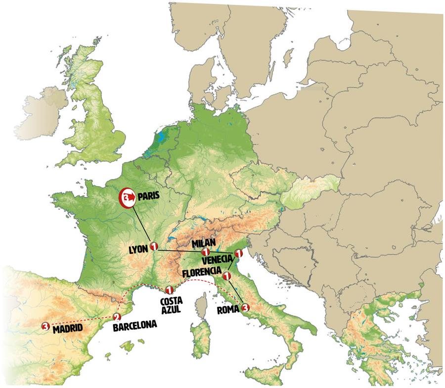 Paradas en Ruta: este circuito admite la posibilidad de que usted pueda programar una o más paradas en su viaje, en la ciudad que desee por período de 1, 3, 4 o 7 noches según circuito y fechas de salida. Es fundamental que el circuito tenga salida posterior a la fecha escogida y permita la salida deseada. El suplemento por parada efectuada es de 40 Euros/52 Dólares por persona. Si la parada se realiza para tomar otro circuito del mismo proveedor no se abonará este suplemento.