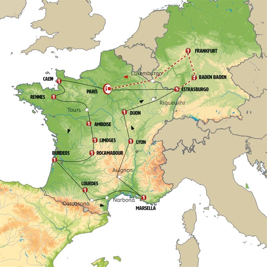 Hoy viajamos hacia Francia pasando por el Gran Ducado de Luxemburgo, un pequeño país de habla alemana (dialecto luxemburgues) y francesa. LUXEMBURGO, llegada a esta cosmopolita ciudad que combina una rica historia con la modernidad de ser un centro financiero y sede de instituciones europeas. Además de su casco antiguo, Patrimonio de la Humanidad, destacan sus fortificaciones, el Palacio Gran Ducal y la Catedral de Notre-Dame. Tras la hora del almuerzo pasamos a Francia. En el centro de la region productora del Champagne paramos en REIMS, tiempo para conocer su impresionante catedral gótica, lugar donde se realizaron las coronaciones de muchos de los reyes de Francia. Llegada a PARIS, al final del día.