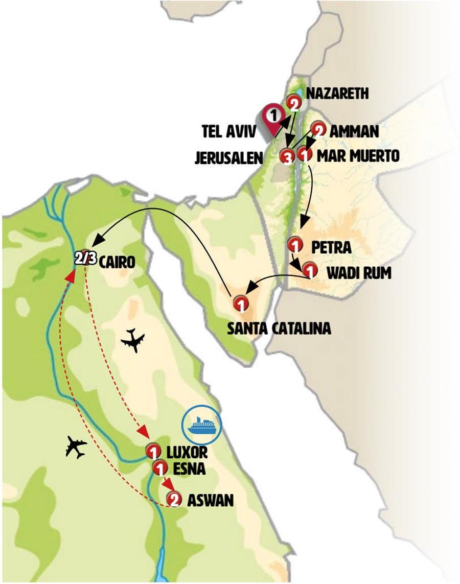 Tras el desayuno salimos a AQABA, la segunda ciudad Jordana, a orillas del Mar Rojo. Un paseo por el centro antes de seguir hacia la frontera de ISRAEL, EILAT, llegada a esta moderna y turística ciudad con sus excelentes playas. Un tiempo de relax para almorzar y pasear ¿se anima a bañarse? Antes de continuar hacia la frontera de EGIPTO. Paso al Sinai, en nuestra ruta fotografiamos la isla del faraón con la potente fortaleza de Saladino. Continuación hacia SANTA CATALINA. Llegada, cena incluida y alojamiento.NOTA: En el paso entre Jordania a Israel y de Israel a Egipto deben abonarse, por parte del viajero, unas tasas de entrada/salida en los diferentes países. Jordania: 15 $ (tasas de salida), Israel: 32 $ (tasa de salida), Egipto: Tasas de entrada a Taba: 25$, Visado de entrada: 45 $ (que en realidad son 25$ de visado + 20$ gastos de tramitación). Tasas aproximadas y sujetas a cambio sin previo aviso por las autoridades del país.Están prohibidos los drones y las cámaras con zoom de 5,5 metros así como otro tipo de cámaras de equipos profesionales ( Europamundo no se responsabiliza de los objetos que puedan ser requisados en las fronteras por parte de las autoridades de los países )NOTA IMPORTANTE: Debido a circunstancias excepcionales o a un número reducido de participantes, puede ocurrir que crucemos directamente de Jordania a Egipto en barco, tomando el FERRY AQABA- TABA con una duración de algo más de dos horas. Durante la travesía en ferry, no habrá asistencia de ningún guía.