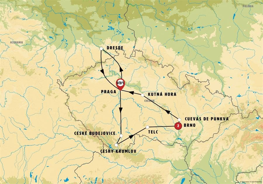 Hoy seguimos conociendo la republica Checa viajando hacia el sur. Bonitos paisajes en la región de Bohemia. Parada en CESKE BUDEJOVICE, capital de Bohemia del Sur. Su centro histórico está bien conservado, con su gran plaza, calles adoquinadas y edificios renacentistas y barrocos. Tiempo para un paseo. Continuamos a CESKY KRUMLOV, hermosísima pequeña ciudad medieval declarada Patrimonio de la Humanidad, sobre un cañón y rodeada de sus murallas. Tiempo para pasear y almorzar. Posteriormente viajamos a TELC, una joya medieval también Patrimonio de la Humanidad por su bien conservado centro histórico donde destaca la plaza principal triangular rodeada de casas burguesas renacentistas y barrocas y su castillo renacentista. Continuamos hacia BRNO, la segunda ciudad de la república Checa, vibrante destino cultural con un casco histórico lleno de arquitectura gótica, renacentista y barroca. La ciudad destaca por su ambiente joven, una próspera escena gastronómica y cafés acogedores.