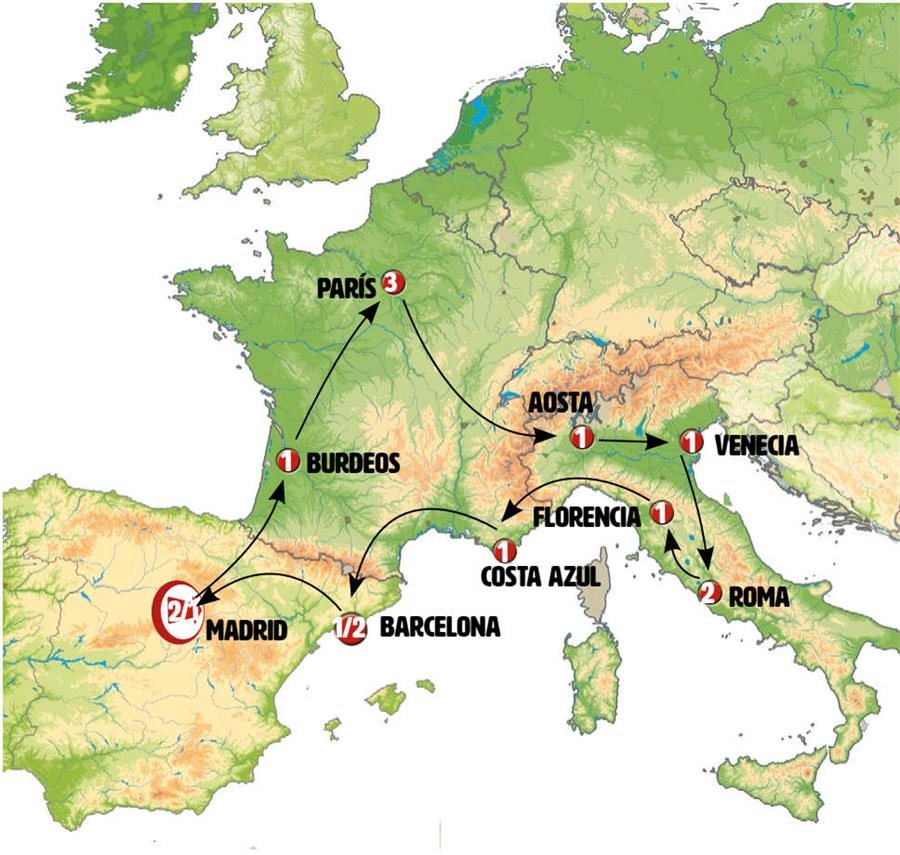 Salimos temprano de MADRID, pasos de montaña, tierras de Castilla. Hermosos paisajes en el País Vasco. SAN SEBASTIÁN, llegada a la hora del almuerzo. Tiempo para almorzar y pasear por el casco histórico o por la hermosa playa de la Concha. Continuación de ruta hacia FRANCIA. BURDEOS, llegada al final de la tarde. Sugerimos un paseo por el centro de esta ciudad declarada Patrimonio de la UNESCO.