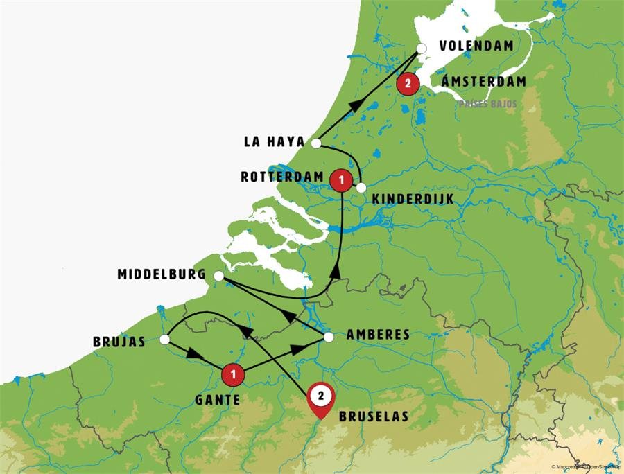 Muy próximo a Gante, temprano, nos dirigimos a BRUJAS, joya medieval Patrimonio de la Humanidad, con canales espejados y casas gremiales que conservan un aire de cuento. Tiempo para caminar o si lo desea para tomar un barco por sus canales. Tras ello, tiempo para pasear y almorzar en SLUIS (La Esclusa), encantador pueblo fortificado que conserva restos de sus murallas medievales y un antiguo molino. Continuamos hacia Países Bajos, donde realizaremos una parada en MIDDELBURG, la tranquila y agradable capital de la provincia de Zelanda, donde destaca su ayuntamiento gótico. Seguidamente tomamos la carretera N57, sobre esclusas y barreras que marcan el límite del “Plan Delta”, maravilla de la ingeniería hidráulica holandesa. Llegaremos a ROTTERDAM al final de la tarde para descubrir la segunda mayor ciudad de los Países Bajos que alberga el mayor puerto de Europa y que destaca por su arquitectura moderna y su vibrante ambiente cosmopolita.