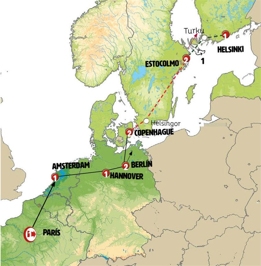 Tiempo libre en BERLÍN. A las 11:30 hrs saldremos de la capital alemana viajando hacia el norte. En la ciudad de Rostock embarcamos en ferry (salida prevista 15.30 hrs) cruzando el mar Báltico hacia DINAMARCA. Travesía de casi dos horas. Disfrute de la travesía en este moderno buque. Llegada a Dinamarca, continuación a través de agradables paisajes. COPENHAGUE, llegada al final del día.