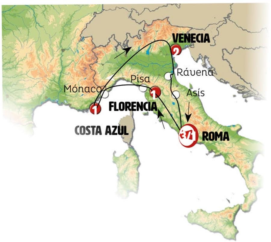 Siguiendo la laguna de VENECIA llegamos a RÁVENA donde podemos conocer el Mausoleo de Gala Placidia y la Basílica de San Vital. Tras ello cruzamos los Apeninos hacia ASÍS, tiempo libre para almorzar y conocer las basílicas. Continuación a ROMA, llegada al final del día.
