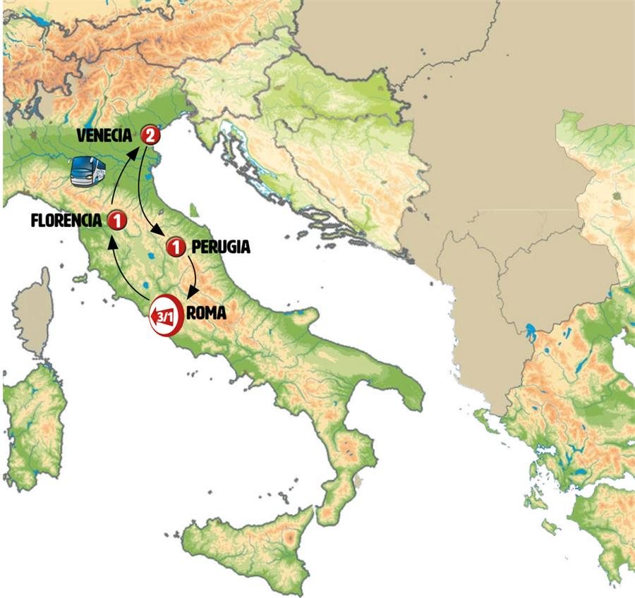 Saldremos hacia PADUA, punto de destino de numerosos peregrinos, donde conocemos la Basílica del Santo. Posteriormente viajamos hacia la costa adriática donde conocemos: SAN MARINO, pequeño país independiente en lo alto de una montaña fuertemente fortificada. Tiempo para almorzar. Continuamos nuestra ruta entre bonitos paisajes de montaña atravesando los Apeninos a GUBBIO, pequeña ciudad maravillosamente conservada, destaca el Palacio de los Cónsules y la catedral del siglo XII. Continuamos a PERUGIA.