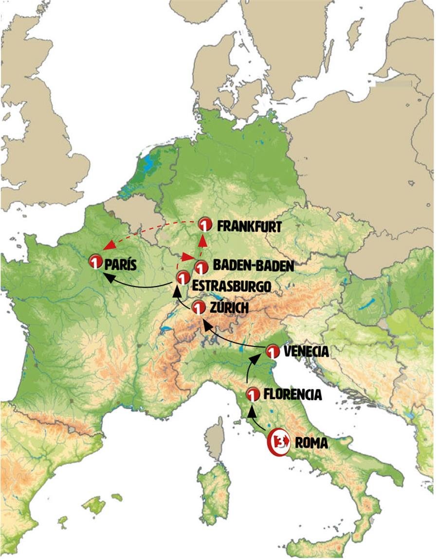 Tiempo en ESTRASBURGO, la capital de Alsacia. La ciudad es sede del Parlamento Europeo. Su centro histórico es bellísimo, con sus calles medievales pintorescas, su impresionante catedral gótica y sus canales y flores. Incluimos un paseo en barco por los canales de la Petite France. A media mañana pasamos a Alemania, conocemos los bonitos paisajes de montaña y pueblos de la Selva Negra. En FRIBURGO, tenemos tiempo para almorzar y pasear por esta ciudad universitaria con su centro medieval y su catedral. Entre muy bonitos paisajes seguiremos a TRIBERG, uno de los pueblos más pintorescos de la Selva Negra conocido por sus relojes de cuco. Incluimos la entrada a las cataratas de Triberg, las más altas de Alemania a la que accedemos por una bonita senda de naturaleza. Realizamos una breve parada para fotografiar GEGENBACH, pequeño pueblo con su bellísima plaza central. Alojamiento en BADEN-BADEN, ciudad balnearia que atrajo a nobles y alta burguesía de toda Europa, sus casinos, su arquitectura y sus parques nos lo recuerdan.