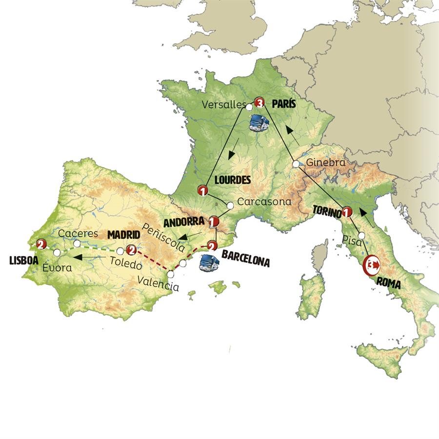 Paradas en Ruta: este circuito admite la posibilidad de que usted pueda programar una o más paradas en su viaje, en la ciudad que desee por período de 1, 3, 4 o 7 noches según circuito y fechas de salida. Es fundamental que el circuito tenga salida posterior a la fecha escogida y permita la salida deseada. El suplemento por parada efectuada es de 40 Euros/52 Dólares por persona. Si la parada se realiza para tomar otro circuito del mismo proveedor no se abonará este suplemento.
