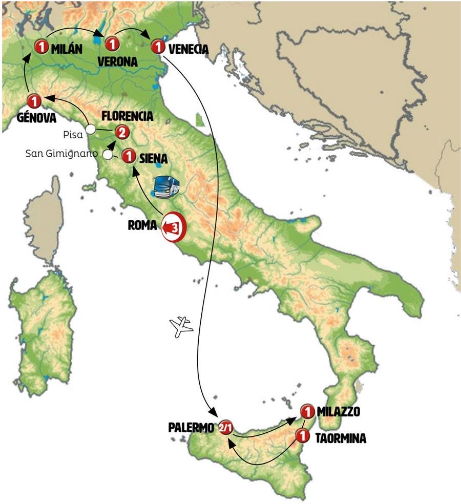 Viajamos a PISA, incluimos un trencito desde el estacionamiento turístico para desplazarnos hasta el recinto monumental Campo de los Milagros donde se encuentra la popular Torre Inclinada. Tras ello vamos a conocer la Costa Ligur que presenta algunos de los rincones marítimos más bonitos de Europa. CINQUE TERRE ha sido declarado Patrimonio de la Humanidad por la UNESCO, cinco poblaciones de fama internacional, casi aisladas por carretera que viven en la actualidad principalmente del turismo. Llegamos en tren, billete incluido a uno de sus encantadores poblados (normalmente VERNAZZA, pero en fechas de mucho turismo podrían ser Manarola o Corniglia, poblaciones muy similares algo menos masificadas) Tiempo para almorzar. Continuamos en tren hasta LEVANTO donde nos espera el autocar para continuar a GENOVA. Tiempo libre en su centro nos recuerda que fue una república pujante en la Edad Media.Nota: El tren a Cinque Terre es un servicio regular de cercanías, no es un servicio turístico. En ocasiones, por exceso de turismo, (existen largas esperas para abordar el trenecito turístico ya que los trenes viajan llenos y no es posible reserva plaza, pudiendo en algunos casos hacerse el viaje sin asiento –de pie).