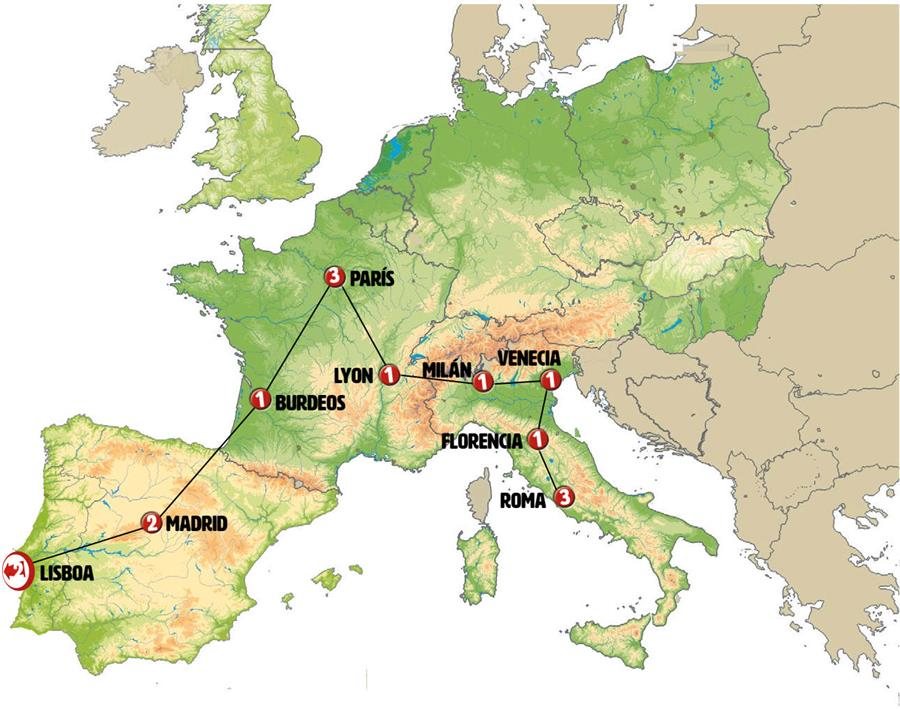 Paradas en Ruta: este circuito admite la posibilidad de que usted pueda programar una o más paradas en su viaje, en la ciudad que desee por período de 1, 3, 4 o 7 noches según circuito y fechas de salida. Es fundamental que el circuito tenga salida posterior a la fecha escogida y permita la salida deseada. El suplemento por parada efectuada es de 40 Euros/52 Dólares por persona. Si la parada se realiza para tomar otro circuito del mismo proveedor no se abonará este suplemento.