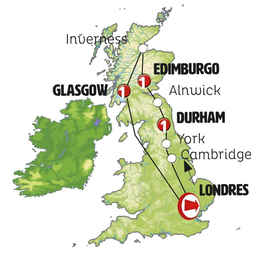 Hoy tenemos una emocionante etapa paisajística por el norte de Escocia (las tierras altas escocesas). Tiempo para dar un paseo y un café en PITLOCHRY, pueblo con encanto. Paso por la ciudad de Inverness en el norte de Escocia, ubicada muy próxima al misterioso LAGO NESS. Tras la hora del almuerzo incluimos la entrada en el castillo medieval de URQUHART desde donde embarcaremos posteriormente para dar un paseo en barco por las oscuras aguas del lago. Pasaremos por FORT AUGUSTUS con sus sistema de esclusas y por FORT WILLIAM, turística ciudad al pie del Benn Nevis, la más alta cumbre del Reino Unido. Regresamos hacia el sur por altas mesetas donde no es difícil contemplar la nieve y posteriormente contorneando el lago Lomond. GLASGOW, llegada al final del día.NOTA MUY IMPORTANTE: Los grupos llegando a Edimburgo desde el 15 de noviembre hasta final del mes de febrero, debido a la corta duración de los días y problemas frecuentes de nieve en las carreteras, se realizará la etapa siguiente:Salida de Edimburgo hacia PITLOCHRY, pintoresca ciudad en el centro de la región escocesa donde más whisky se produce. Conocemos en la zona una tradicional destilería de whisky (entrada incluida). Continuamos hacia STIRLING, de impresionante centro histórico dominado por el gran castillo, uno de los más importantes de Escocia al haber sido testigo de numerosos eventos históricos, incluyendo no sólo batallas históricas, sino también la coronación de varios de sus reyes. Reserva y entradas incluidas. Tiempo para almorzar. Tras ello, paramos para fotografiar Los Kelpies, enormes esculturas de dos caballos con cabezas de agua de la mitología escocesa. Continuación a GLASGOW, tiempo para pasear por el centro de la ciudad y alojamiento.