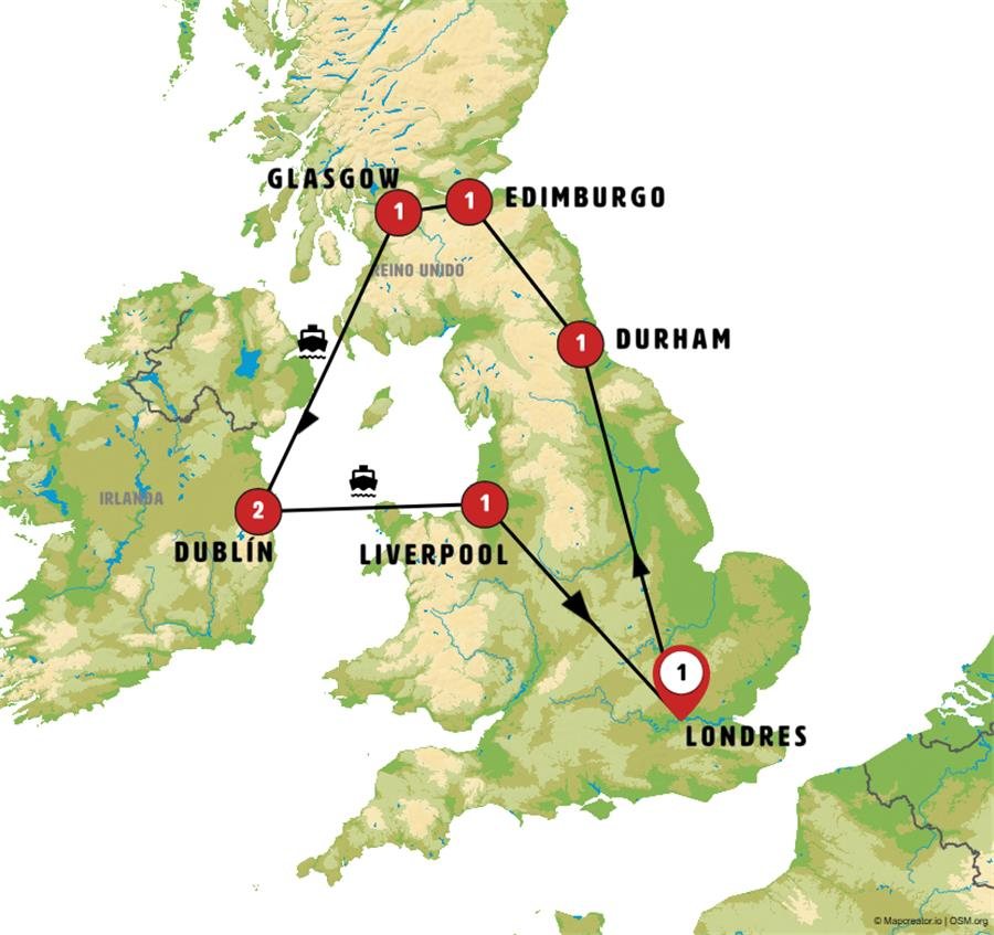 Al comienzo de la mañana embarcamos en ferry. Tras travesía de aproximadamente entre tres y tres horas y media llegamos a Gales. Conocemos CAERNARFON, ciudad Patrimonio de la Humanidad, junto al mar dominada por un imponente castillo. Tiempo para pasear y almorzar. Viajamos a continuación a LIVERPOOL, donde daremos un breve paseo en autobús por la ciudad, Patrimonio de la Humanidad y segundo puerto de Reino Unido, conocida popularmente por los Beatles. ¿Se anima a conocer su museo?