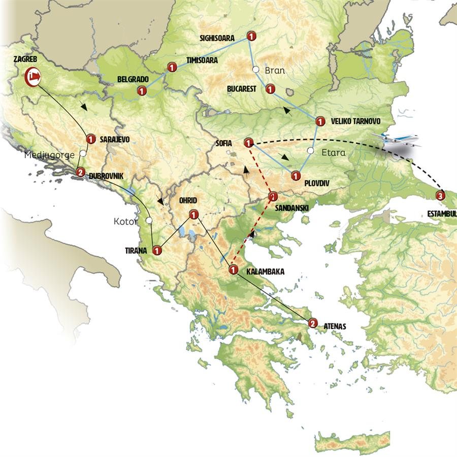 Viajamos por MACEDONIA hacia GRECIA. Haremos una parada en BITOLA, ciudad con una rica herencia histórica y un ambiente encantador, conocida por su arquitectura otomana y neoclásica. Tendréis tiempo para pasear por la Širok Sokak, una zona llena de cafés, restaurantes y tiendas. Tras los trámites fronterizos, entraremos en Grecia. El norte del país tiene una fuerte influencia eslava y otomana y una geografía muy accidentada. Continuaremos hacia la región de Las Meteoras. A las afueras de KALAMBAKA, pararemos en KASTRAKI, pintoresco pueblo con hermosas vistas de todo el valle antes de visitar el impresionante valle de LAS METEORAS, declarado Patrimonio de la Humanidad por la UNESCO. Recorreremos todo el valle e incluimos la entrada a uno de los más famosos monasterios colgados en las rocas. Llegada a KALAMBAKA, cena incluida.