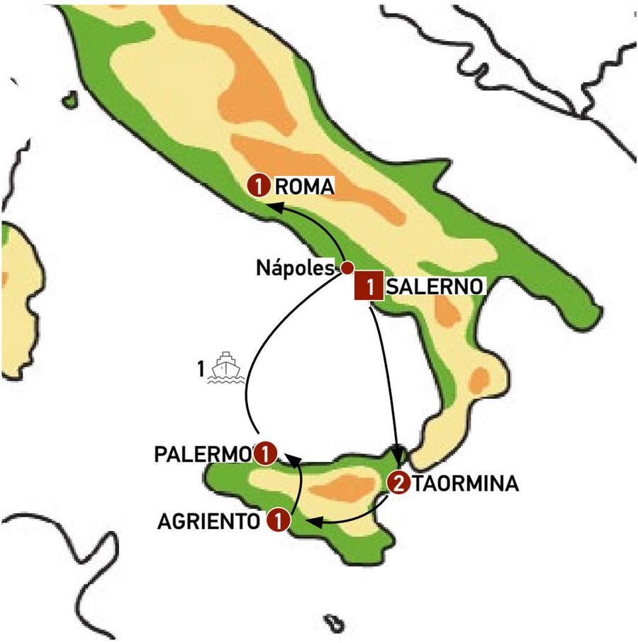 Viajamos hacia el sur de "la bota". Atractivos paisajes del sur de Italia atravesando el Parque Nacional de Cilento. Llegamos a PAOLA, a orillas del mar Tirreno, visitamos el santuario de San Francisco de Paola y tenemos tiempo libre para almorzar en su bonito centro histórico. Continuamos la ruta a VILLA SAN GIOVANNI donde embarcamos en corta travesía hacia la isla de SICILIA. Llegada a MESSINA en donde tendremos tiempo para dar un paseo junto a la catedral. Continuación a TAORMINA. Cena incluida.NOTA: Alojamiento en la "región de Taormina", en alguna fecha puntual el alojamiento podrá ser dado en Messina.