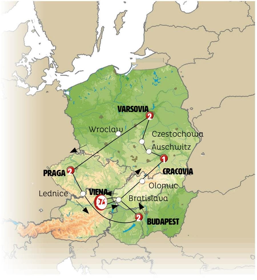 Por la mañana incluimos una visita panorámica con guía local de Cracovia, la capital de la "Pequeña Polonia" fundada en el s. VII, cuyo casco antiguo ha sido declarado Patrimonio de la Humanidad por la UNESCO. En nuestra visita conoceremos, además de sus bonitas calles medievales, la plaza del Mercado, una de las mayores de Europa y corazón de la ciudad y la colina del castillo de Wawel, antigua residencia de los reyes polacos. Tras la hora del almuerzo viajamos hacia AUSCHWITZ II-BIRKENAU, el antiguo campo de concentración que nos recuerda ciertos momentos de la historia de Europa. Visitaremos el campo 2, Birkenau, donde llegaban los trenes procedentes de toda Europa. Posteriormente en CZESTOCHOWA, visitamos el Monasterio de Jasna Gora donde se encuentra la Virgen Negra, lugar de peregrinación muy concurrido. Llegada a VARSOVIA al final de la tarde.Nota: En ocasiones pueden existir dificultades para conseguir las entradas requeridas en Auschwitz, en estas ocasiones el programa puede ser modificado (normalmente entrando en el campo de concentración a una hora más tardía y visitando Wadovice en lugar de Czestochowa)